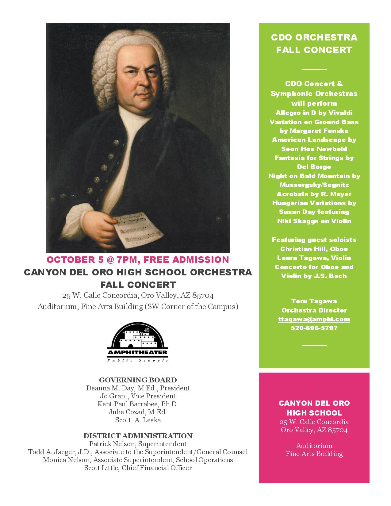 CDO Orchestra Concert on October 5 at 7pm Posted bycdoorchestraSeptember 25, 2015Posted inUncategorized Announcing CDO Orchestra’s Fall Concert Monday, October 5th, at 7pm Location: Canyon del Oro High School, Auditorium, 25 W. Calle Concordia, Oro Valley, AZ Featuring Guest Soloist Laura Tagawa, Violin and Christian Hill Share this: Click to share on X (Opens in new window) X Click to share on Facebook (Opens in new window) Facebook Like Loading... Related